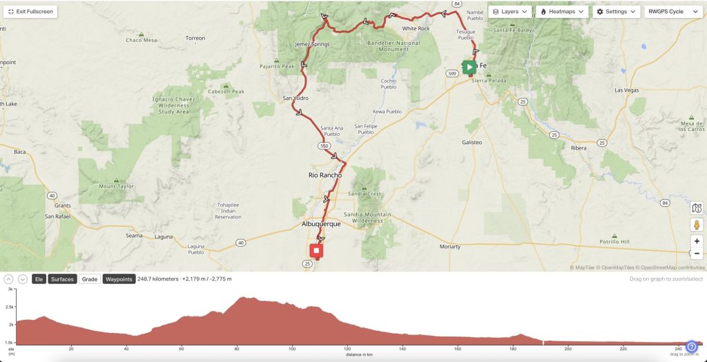 Here we go again; another round of the Isleta Runner Randonnée 250km, a ride from Santa Fe to Isleta Pueblo, NM, culminating in catching the NM Rail Runner back to Santa Fe. Heading north to Los Alamos, skirting the Valles Caldera National Preserve, enjoying the eye-catching red rocks of Jemez Pueblo, flying south from San Ysidro on NM550 to Bernalillo to catch some vibes at Bosque Brewing North before boarding the planned locomotive. If we have made good time and folks are motivated, we will try for some more kilometers to catch the train in Isleta Pueblo.